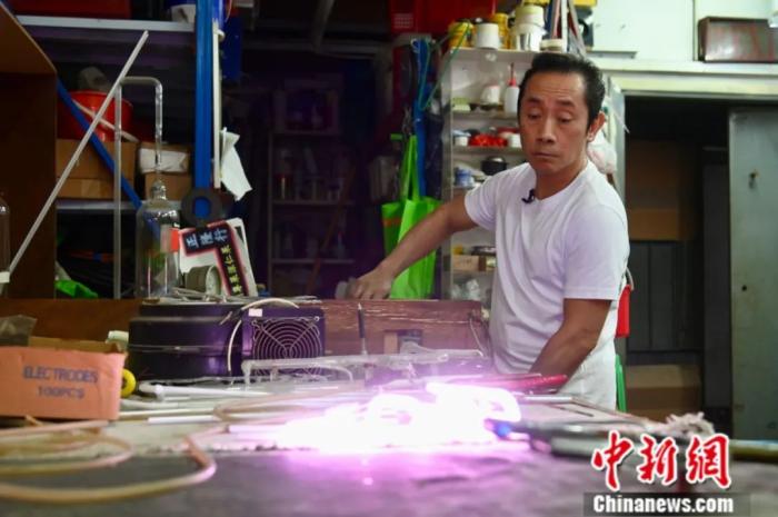 香港霓虹燈招牌師胡智楷早前接受中新社記者專訪。中新社記者 李志華 攝