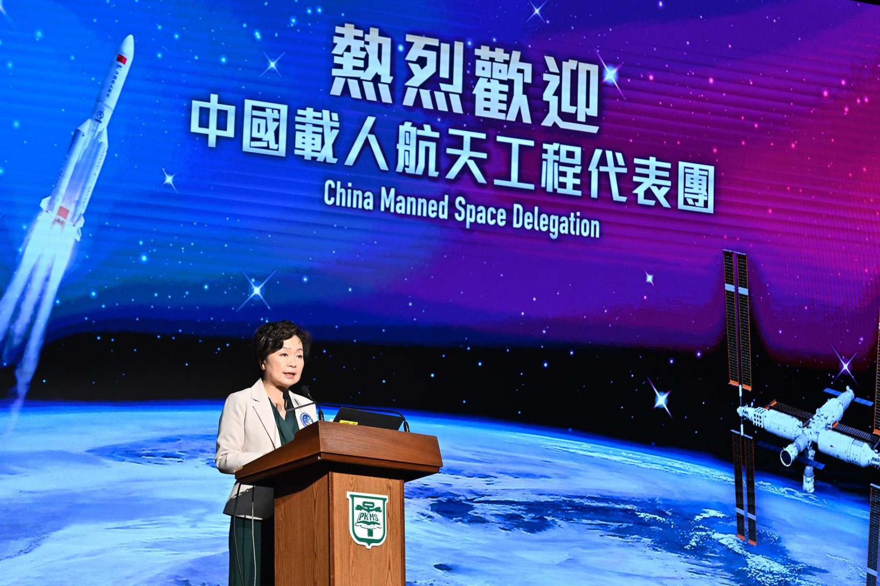 香港特區教育局局長蔡若蓮博士11月29日出席在培僑中學舉行的「中國載人航天工程代表團與中、小學生真情對話」活動,並在活動上致辭。