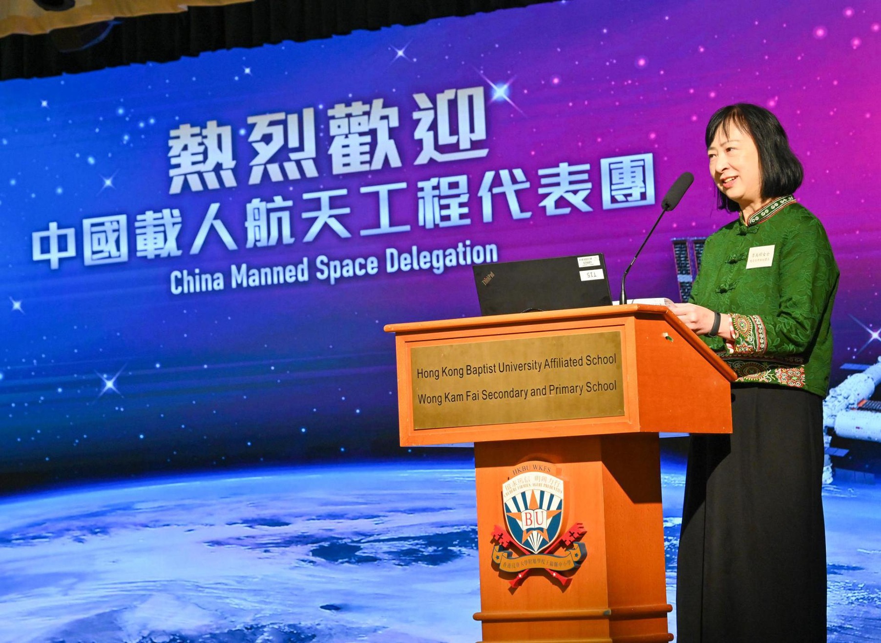 香港特區教育局常任秘書長李美嫦11月29日出席在香港浸會大學附屬學校王錦輝中小學舉行的「中國載人航天工程代表團與中、小學生真情對話」活動,並在活動上致辭。