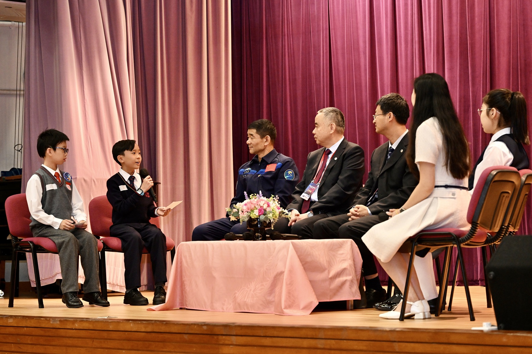 中國載人航天工程代表團11月29日繼續在港訪問,圖示(左三起)神舟十二號乘組航天員劉伯明、代表團成員王學武和鐘紅恩出席在馬頭涌官立小學(紅勘灣)舉行的「中國載人航天工程代表團與中、小學生真情對話」活動。
