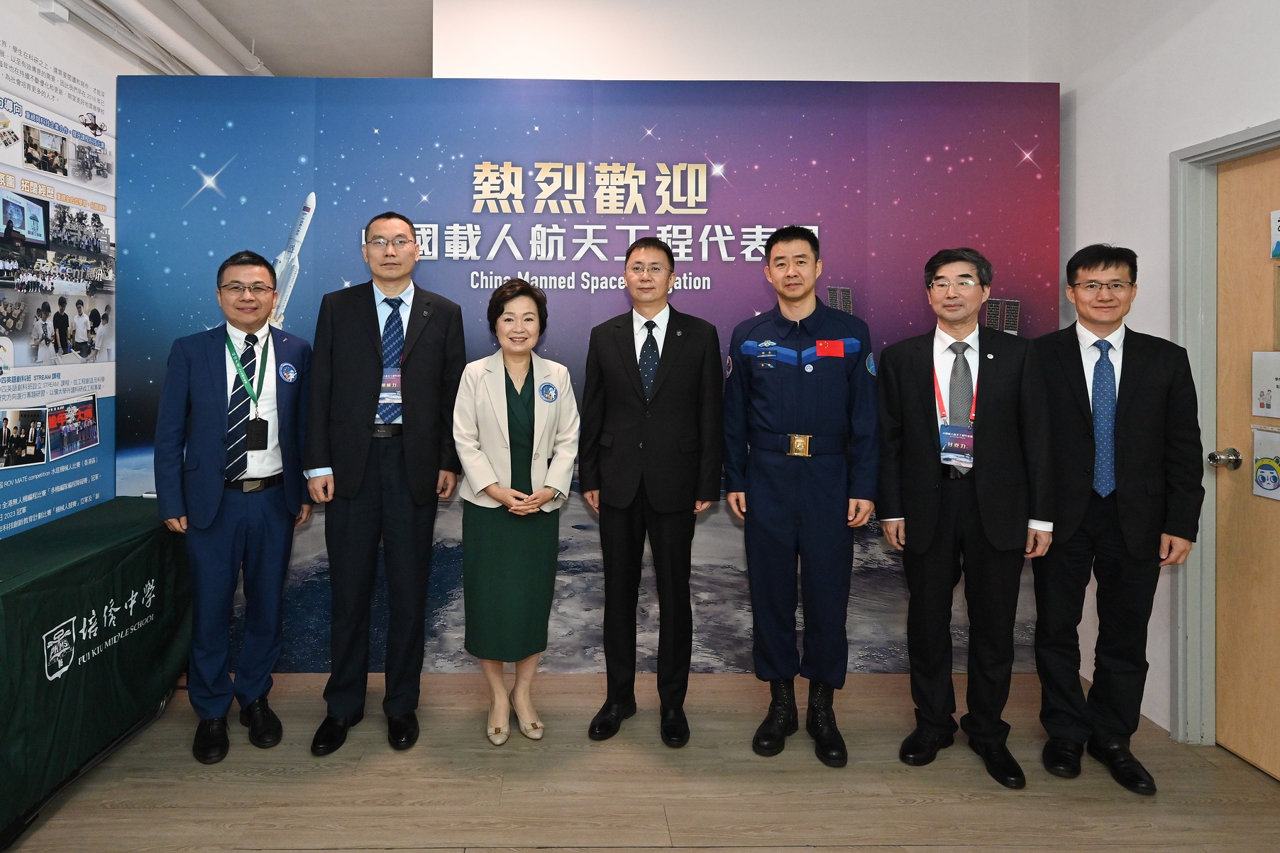 中國載人航天工程代表團11月29日繼續在港訪問,圖示(左三起)香港特區教育局局長蔡若蓮博士、代表團團長兼中國載人航天工程辦公室副主任林西強、神舟十四號乘組指令長陳冬和代表團成員出席在培僑中學舉行的「中國載人航天工程代表團與中、小學生真情對話」活動。