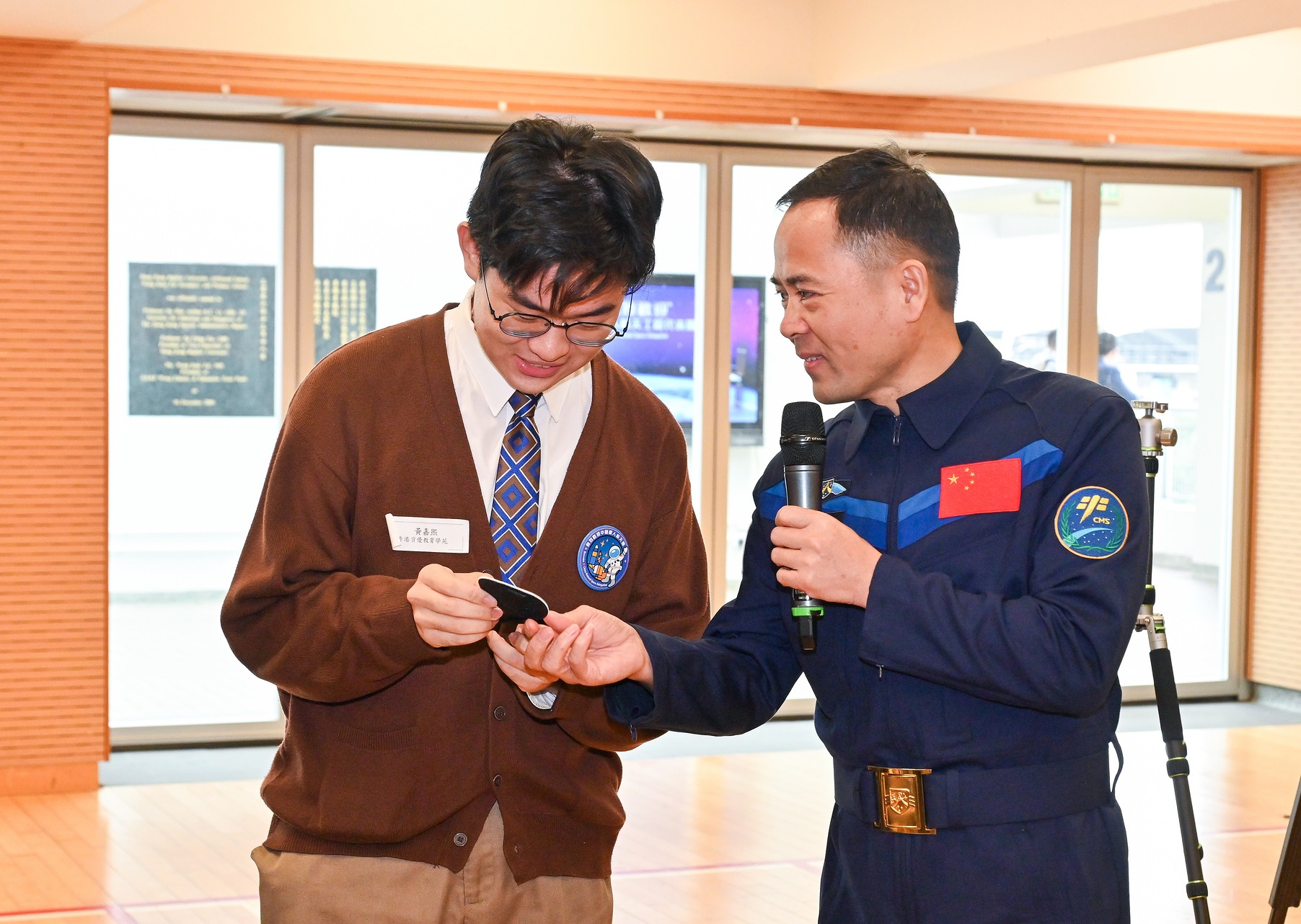 中國載人航天工程代表團11月29日繼續在港訪問,圖示神舟十五號乘組航天員張陸(右)出席在香港浸會大學附屬學校王錦輝中小學(中學部)舉行的「中國載人航天工程代表團與中、小學生真情對話」活動。