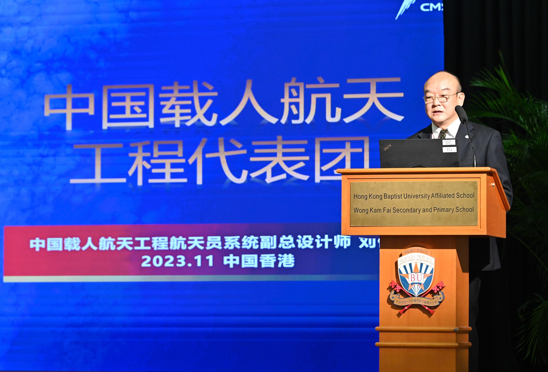 中國載人航天工程代表團11月29日繼續在港訪問,圖示中國載人航天工程航天員系統副總設計師劉偉波出席在香港浸會大學附屬學校王錦輝中小學(中學部)舉行的「中國載人航天工程代表團與中、小學生真情對話」活動。