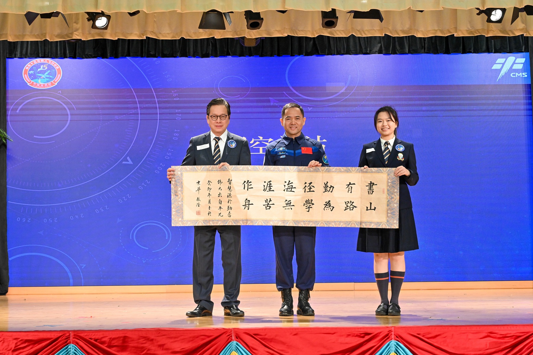 中國載人航天工程代表團11月29日繼續在港訪問,圖示神舟十五號乘組航天員張陸(中)出席在香港浸會大學附屬學校王錦輝中小學(中學部)舉行的「中國載人航天工程代表團與中、小學生真情對話」活動。