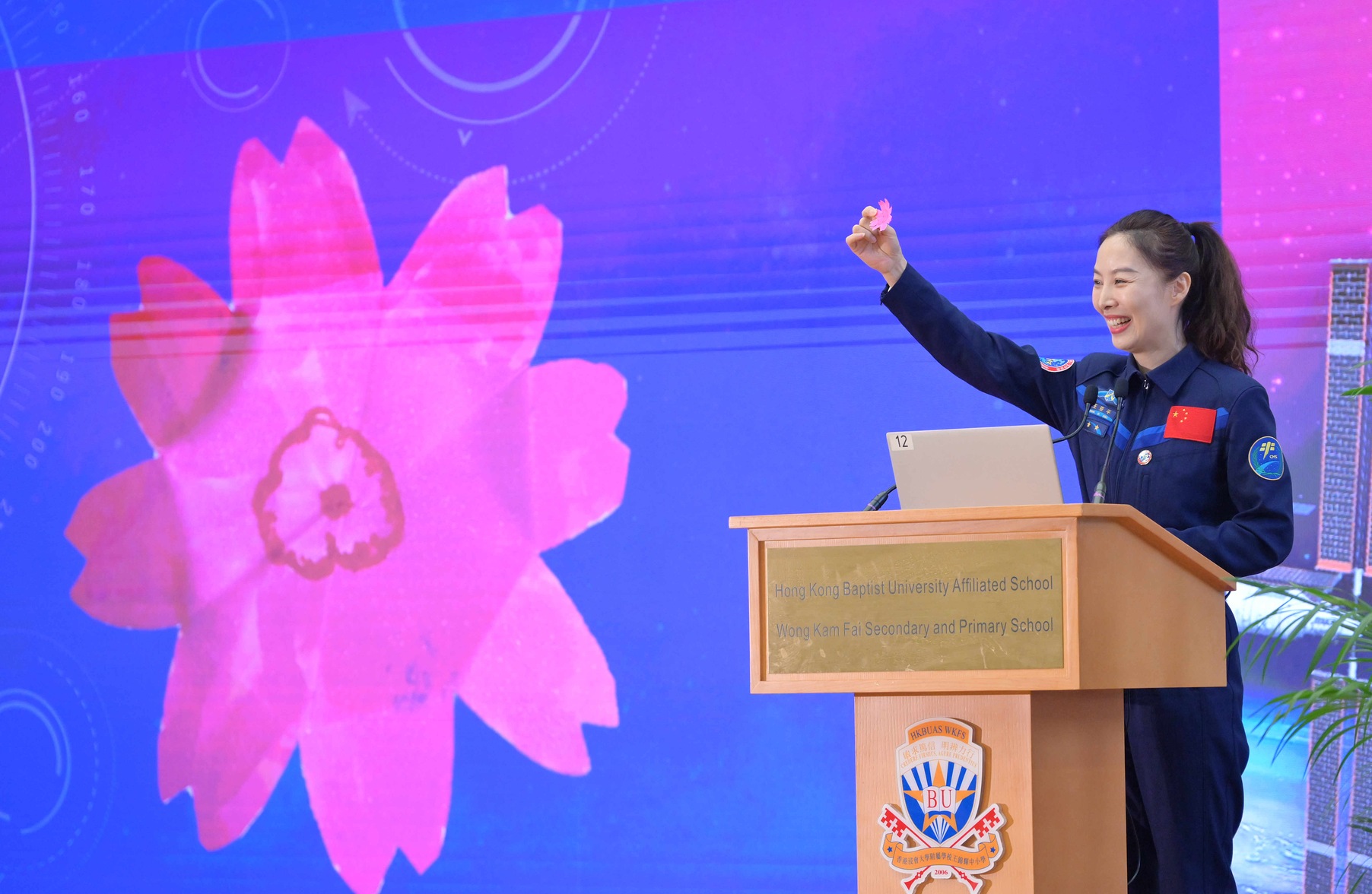 中國載人航天工程代表團11月29日繼續在港訪問,圖示神舟十三號乘組航天員王亞平出席在香港浸會大學附屬學校王錦輝中小學(小學部)舉行的「中國載人航天工程代表團與中、小學生真情對話」活動。