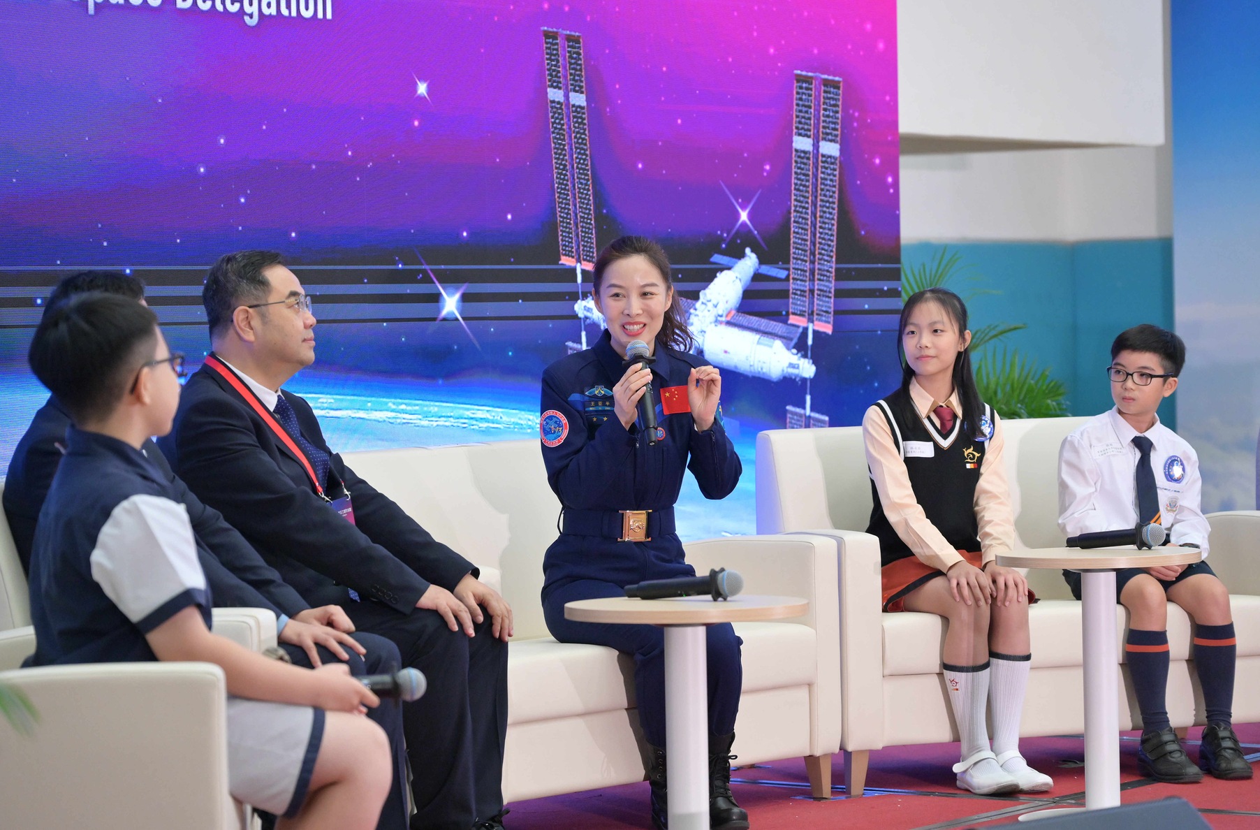 中國載人航天工程代表團11月29日繼續在港訪問,圖示神舟十三號乘組航天員王亞平(右三)出席在香港浸會大學附屬學校王錦輝中小學(小學部)舉行的「中國載人航天工程代表團與中、小學生真情對話」活動。
