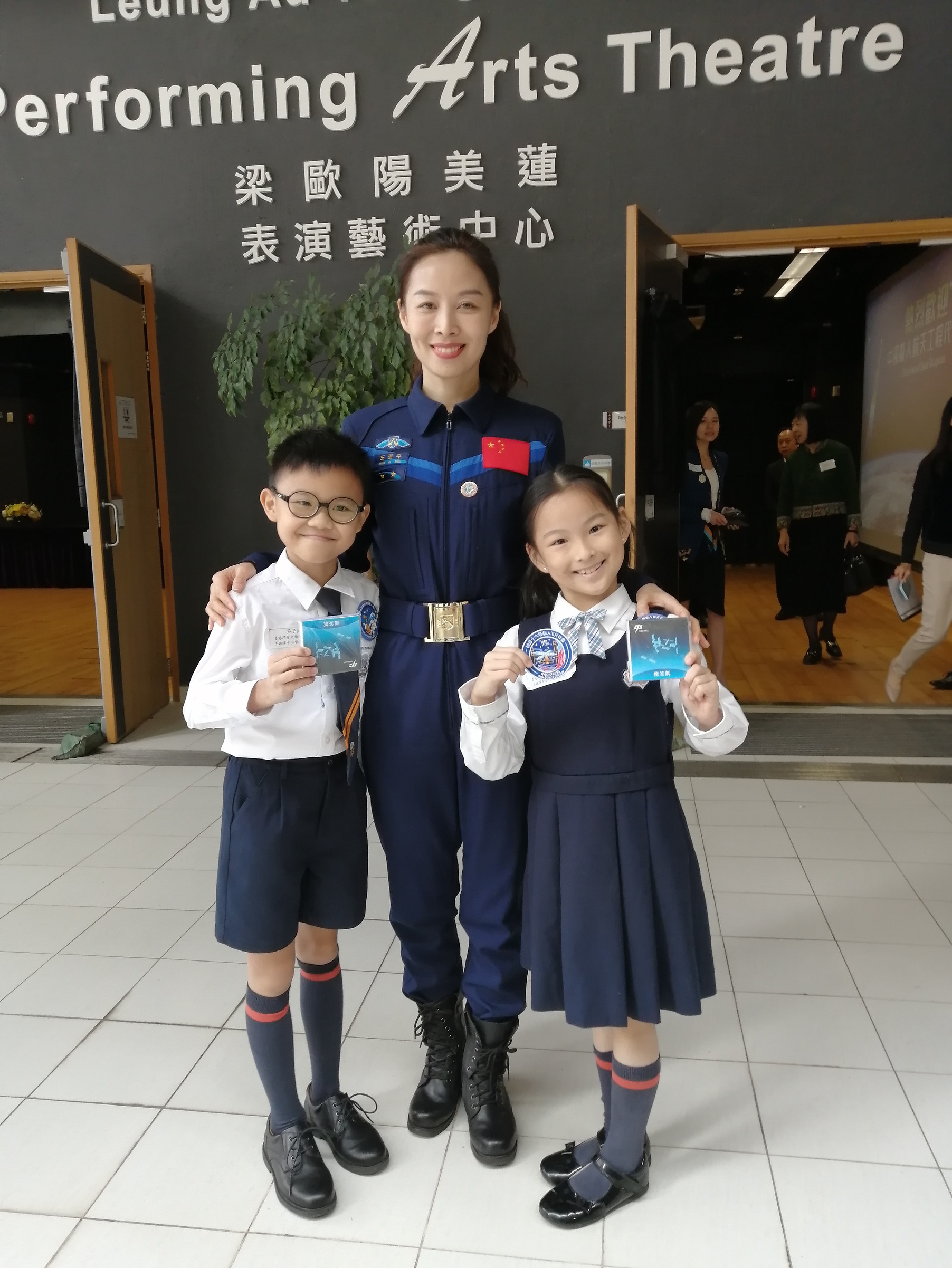中國載人航天工程代表團11月29日繼續在港訪問,圖示神舟十三號乘組航天員王亞平(中)出席在香港浸會大學附屬學校王錦輝中小學(小學部)舉行的「中國載人航天工程代表團與中、小學生真情對話」活動。