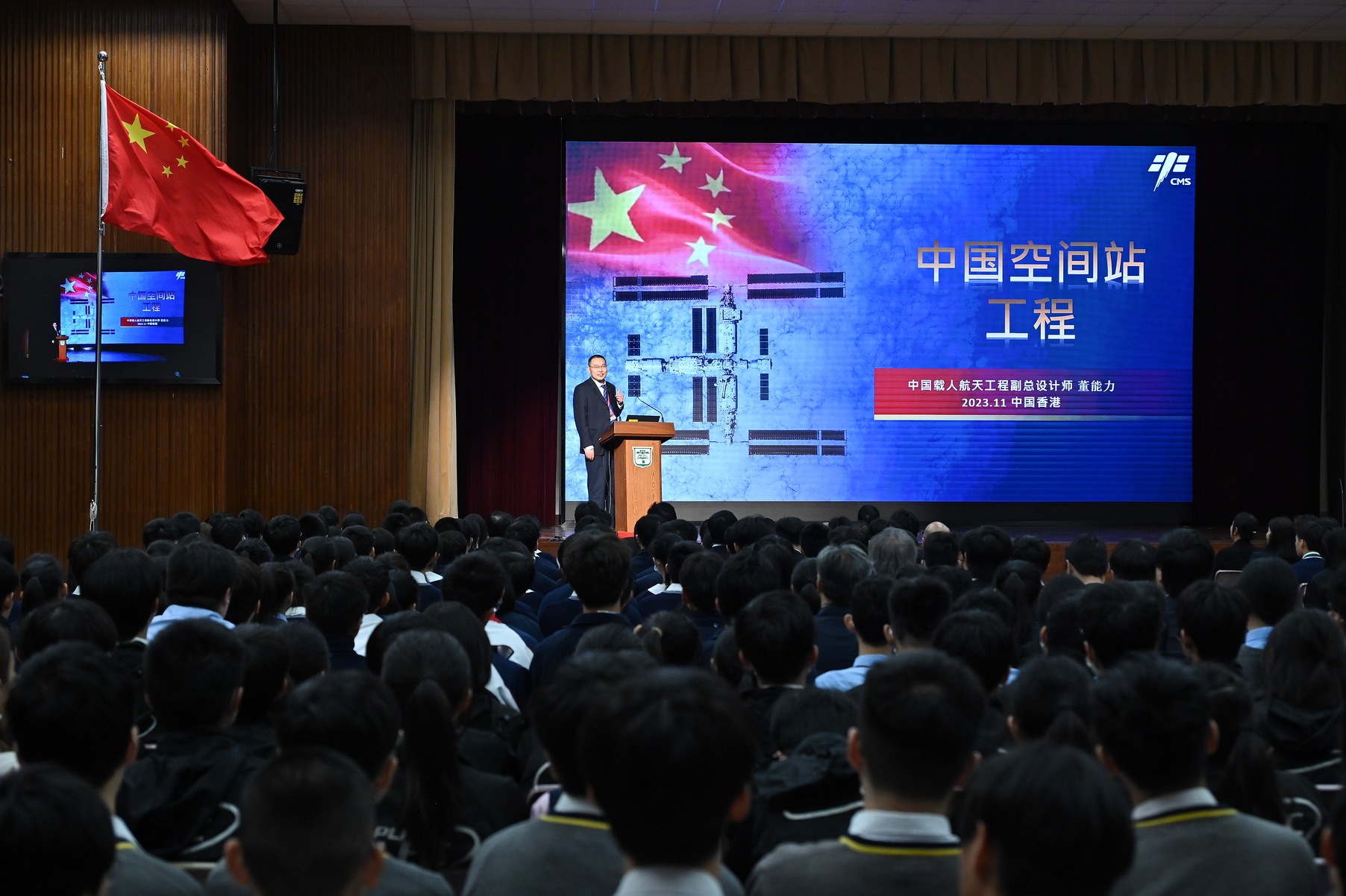 中國載人航天工程代表團11月29日繼續在港訪問,圖示中國載人航天工程副總設計師董能力出席在培僑中學舉行的「中國載人航天工程代表團與中、小學生真情對話」活動。