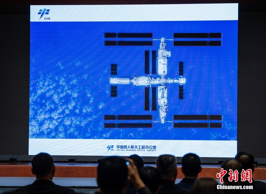 11月28日,抵達香港訪問的載人航天工程代表團在香港會展中心舉行媒體見面會,代表團團長、中國載人航天工程辦公室副主任林西強在見面會上首次發布中國空間站組合體全景照片,這是中國首次在軌獲取以地球為背景的空間站組合體全貌圖像,是中國空間站的第一組全構型工作照,該組照片是由神舟十六號乘組返回地面前手持高清相機通過飛船繞飛拍攝。中新社記者 侯宇 攝