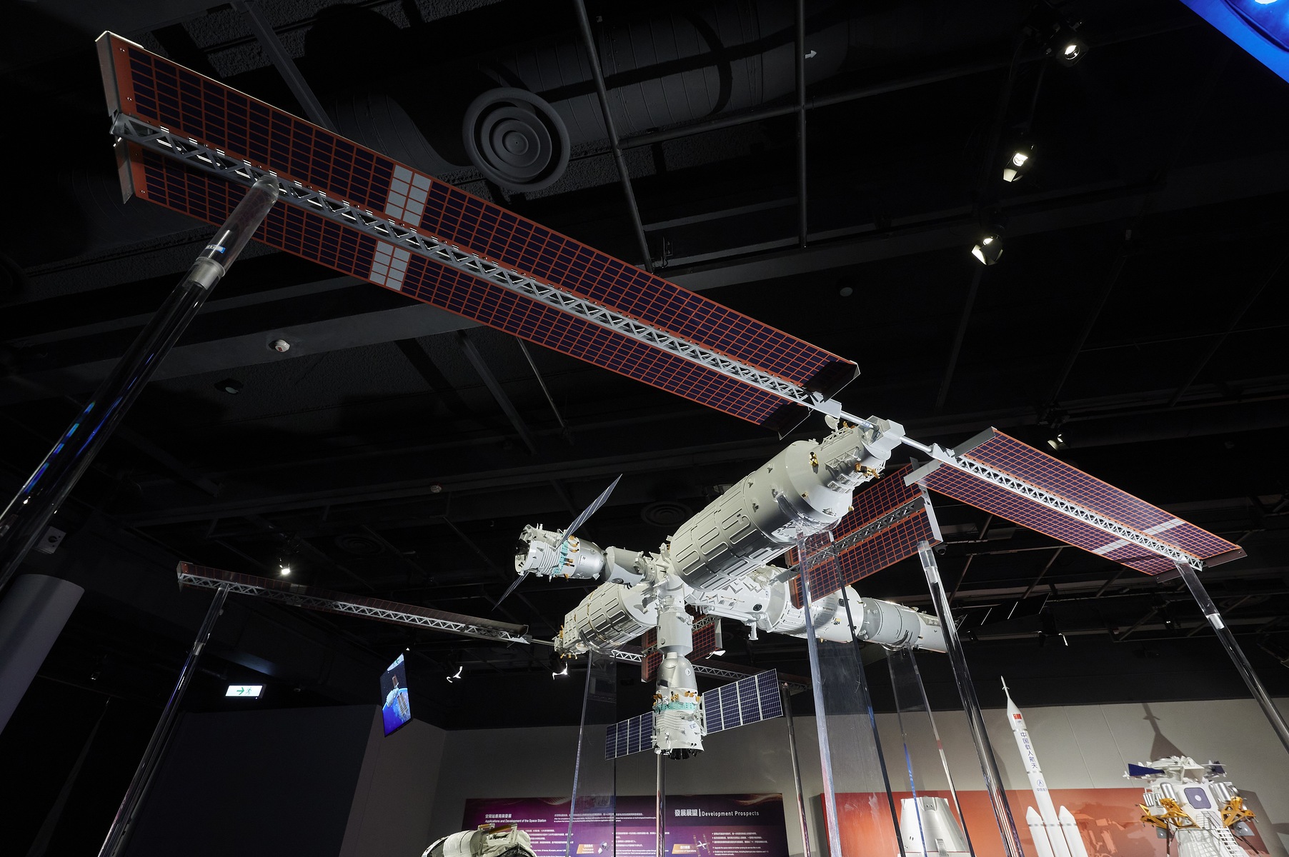 中國載人航天工程展12月1日起至明年2月18日在香港科學館和香港歷史博物館舉行。圖示1:15的中國空間站模型。
