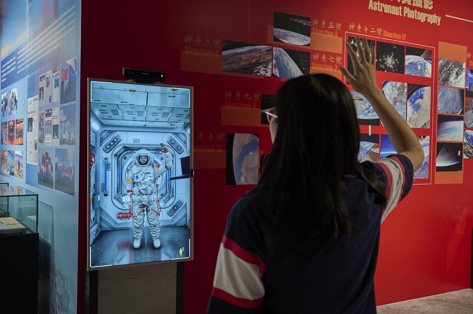 中國載人航天工程展12月1日起至明年2月18日在香港科學館和香港歷史博物館舉行。圖示觀眾在「太空照相館」穿上虛擬航天服,在空間站艙內和艙外拍攝相片留念。