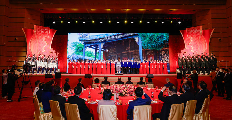 夜幕下,坐落在維港邊的香港會展中心流光溢彩。招待會開始前,香港和廣東佛山龍獅隊攜手演繹的舞龍舞獅慶新春表演,香港中樂團青少年團慷慨激昂的樂曲聯奏,由駐港聯絡辦、駐港國安公署、外交部駐港公署、解放軍駐港部隊以及香港培僑中學學生、亞運會港隊運動員代表等深情合唱的《灣區是故鄉》,將現場氣氛烘托得十分熱烈。