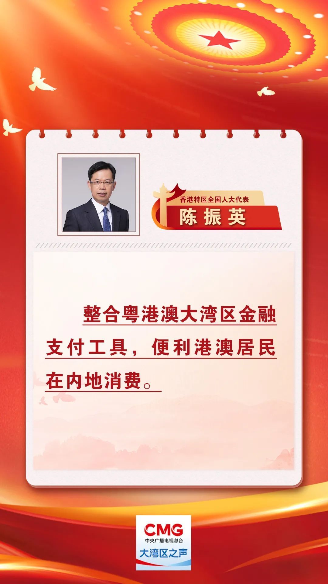 香港特區全國人大代表陳振英帶來多項有關便利港澳居民在內地出行與消費的相關建議。他建議整合粵港澳大灣區金融支付工具,推出官方支付平台,實現大灣區內任何錢包自動兌換貨幣支付功能,從而進一步便利港澳居民在內地的出行和消費。