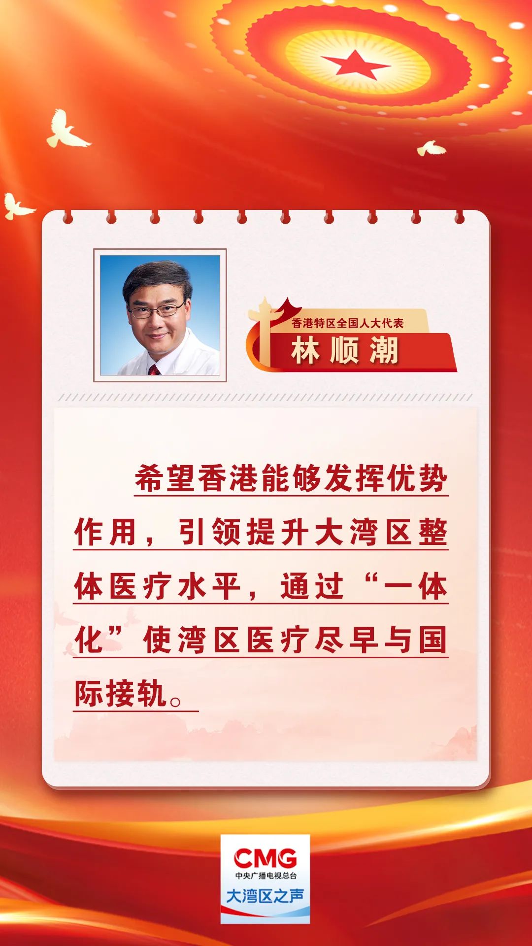 香港特區全國人大代表林順潮帶來了多項聚焦於醫療健康領域的建議。他指出,香港醫療水平與國際接軌,他希望能夠發揮優勢作用,引領粵港澳大灣區整體醫療水平的提升,通過「一體化」使灣區醫療儘早與國際接軌,他建議出台措施促進大灣區醫療人才、技術等環節的互聯互通,加快大灣區醫療産業發展。