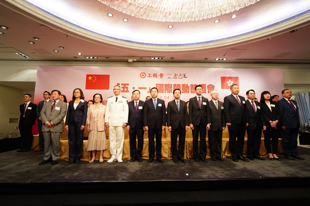 本網訊 4月23日,香港工聯會舉辦慶祝「五一」國際勞動節酒會。香港特區行政長官李家超、中央政府駐港聯絡辦副主任何靖應邀出席,並與駐港國家安全公署、外交部駐港特派員公署、駐港部隊有關負責人等共同主禮。香港社會各界嘉賓及工會代表逾千人出席。