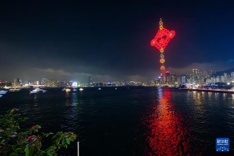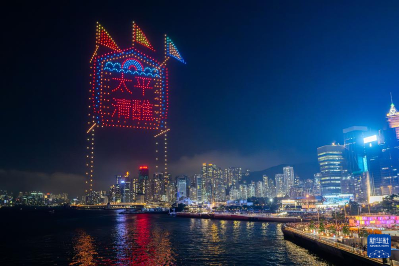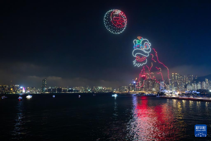 當晚8時許,千架無人機在維港夜空組成多幅以傳統節慶為主題的動態圖案,包括太平清醮特色花牌、醒獅、平安結等。其中,約60米高的立體包山壯觀搶眼,包山頂部更有一個直徑達30米的巨大「平安包」,祝福市民和旅客平安健康。