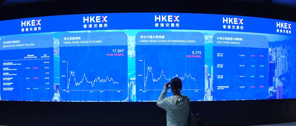沒有了昔日交易大堂裏坐滿「紅背心」交易員時的人聲鼎沸,西裝革履的人們步履依舊匆匆,踏過厚實的地毯,留下一路靜謐。巨型屏幕上滾動顯示着恒生指數、恒生中國企業指數、恒生科技指數……滾動的數字背後,是香港這座金融之城的澎湃活力。