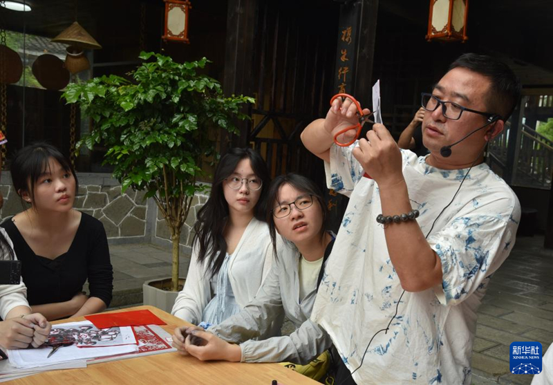 7月3日,香港師生在貴州省務川縣龍潭村體驗仡佬族剪紙技藝。新華社記者 駱飛 攝
