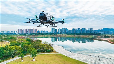 圖為億航無人駕駛載人航空器在廣州九龍湖上空飛行。李劍鋒攝