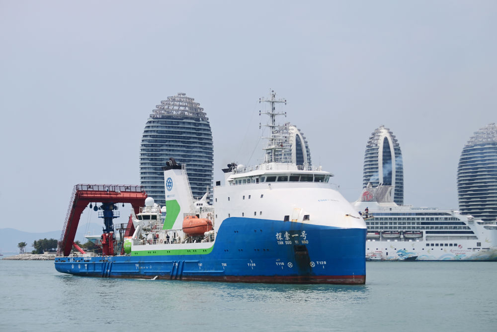 「探索一號」科考船搭載「奮鬥者」號全海深載人潛水器返回海南三亞(2024年3月28日攝)。此次科考歷時50天,順利完成中國-印度尼西亞爪哇海溝聯合深潛任務。新華社發(沙曉峰 攝)