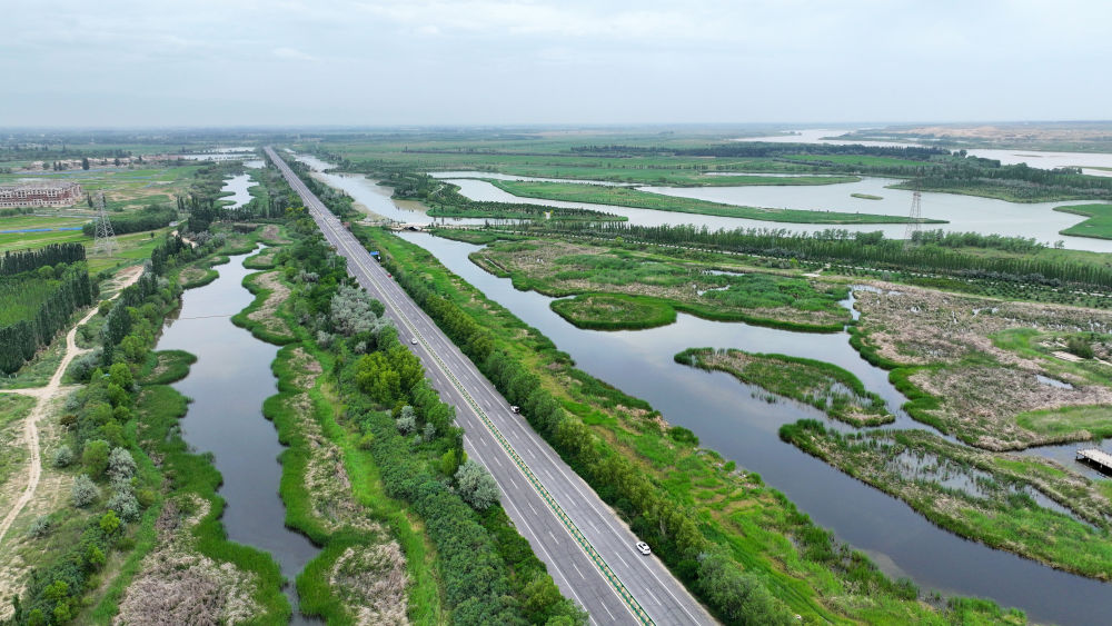這是2024年6月13日拍攝的黃河寧夏段濱河大道(無人機照片)。近年來,寧夏努力建設黃河流域生態保護和高質量發展先行區,全力打好黃河保護持久戰。新華社記者 王鵬 攝