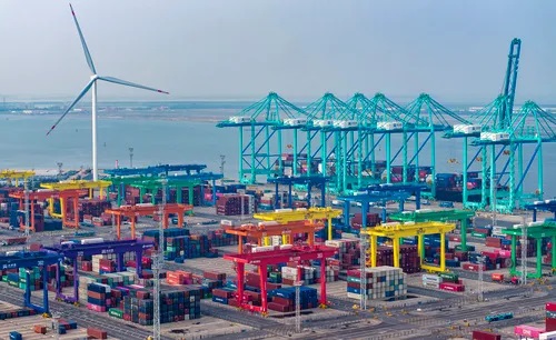 一艘集裝箱貨輪停靠在天津港「智慧零碳」碼頭。新華社記者 趙子碩 攝
