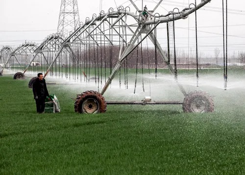 河南省焦作市博愛縣孝敬鎮東原莊村瑞輝家庭農場,村民使用全自動指針式噴灌機進行澆灌作業。新華社發(程全攝)