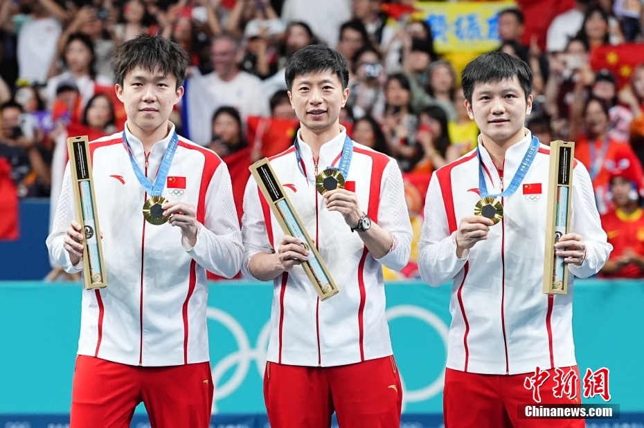 在巴黎奧運會乒乓球男團金牌賽中,中國隊以3比0戰勝瑞典隊,獲得冠軍。中新社記者 趙文宇 攝