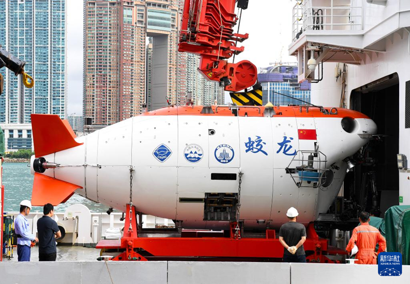 這是停靠於香港尖沙咀海運碼頭的「深海一號」遠洋科考船上的「蛟龍號」(9月24日攝)。 新華社記者 陳鐸 攝