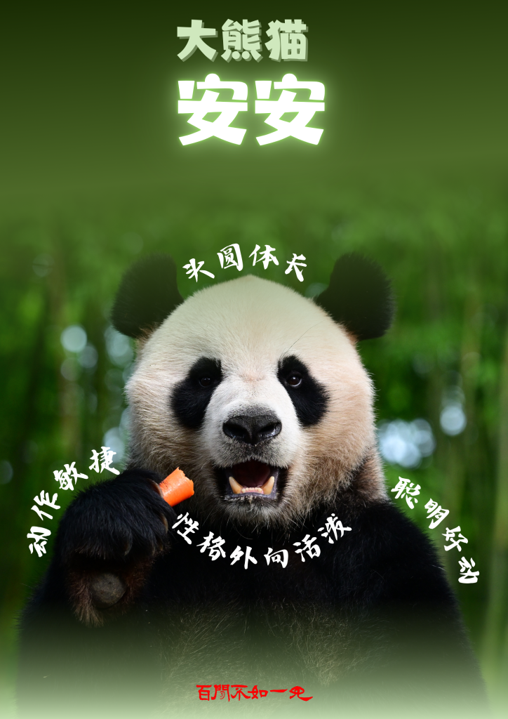 大熊貓「安安」,雄性,2019年6月出生,頭圓體長,動作敏捷,聰明好動,性格外向活潑。