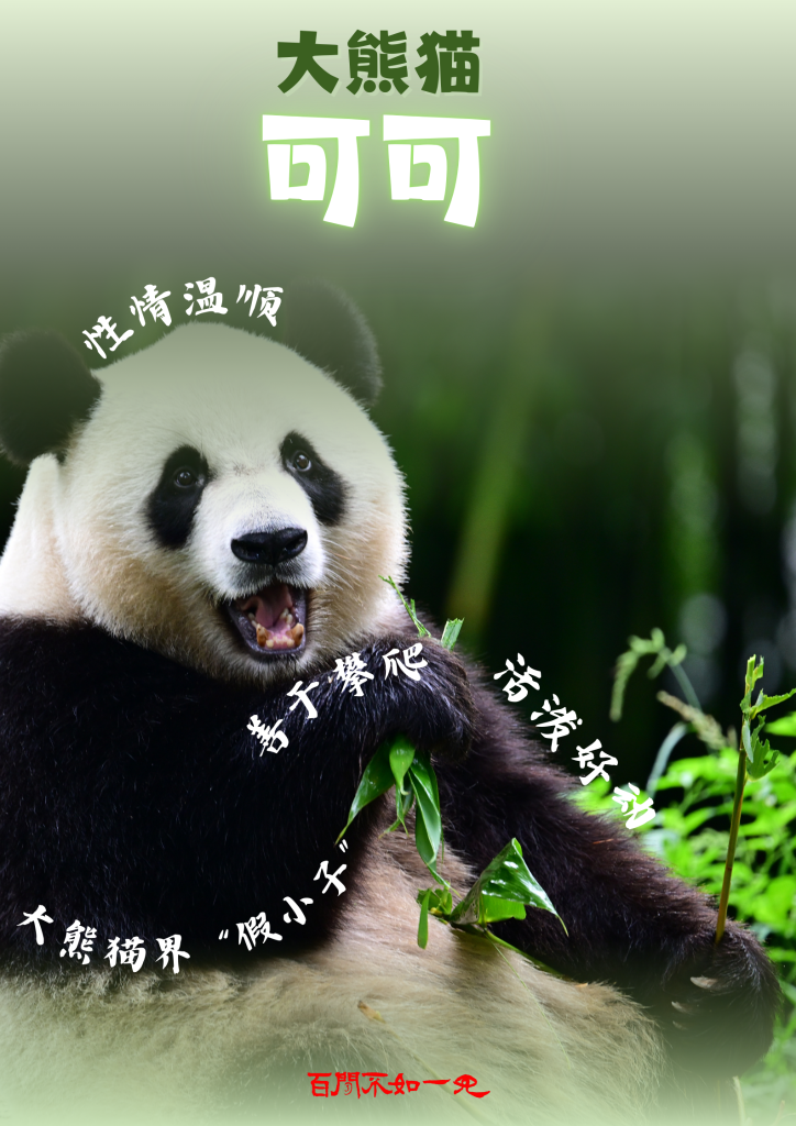 大熊貓「可可」,原名「甜可」,雌性,2019年6月出生,性情溫順、活波好動,善於攀爬,典型的大熊貓界「假小子」。
