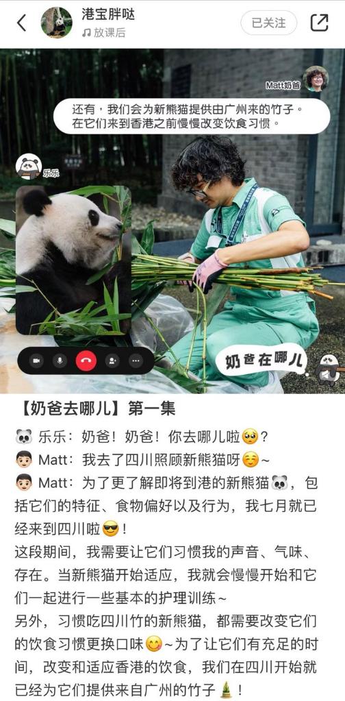 為了解新赴港大熊貓的特徵、食物偏好以及行為,香港海洋公園的大熊貓護理員梁家綸7月已抵達四川,讓大熊貓們習慣他的聲音、氣味、存在,大熊貓適應後,他開始和它們一起進行基本護理訓練。