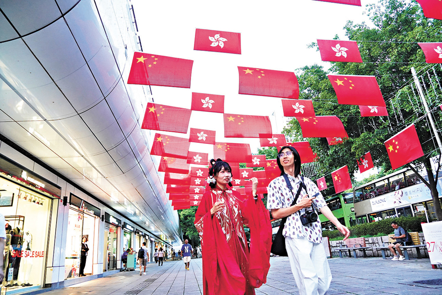 尖沙咀街上旗幟飄揚,國慶氣氛極濃。(香港文匯報記者曾興偉 攝)