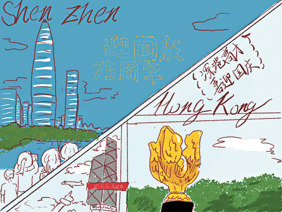 畫作上,一邊是深圳的人才公園,一邊是香港的金紫荊廣場。他們説,這寓意深港一家親、粵港澳大灣區共同發展。他們期待與香港一起,共同創造更美好的未來,祝祖國繁榮昌盛、山河錦繡、國泰民安。