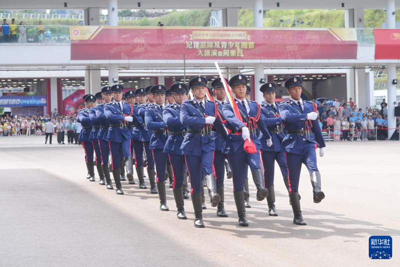 10月1日,香港紀律部隊連同青少年制服團體在消防及救護學院舉行升旗禮及匯演。圖為紀律部隊儀仗隊及青少年制服團體以中式步操進場。新華社發(香港特區政府供圖)