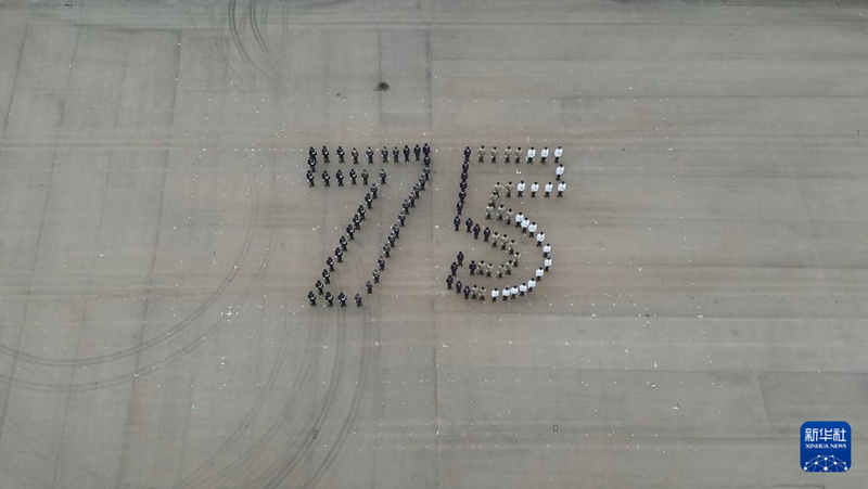 10月1日,香港紀律部隊連同青少年制服團體在消防及救護學院舉行升旗禮及匯演。圖為紀律部隊人員在步操匯演中排列出數字「75」的隊形。新華社發(香港特區政府供圖)