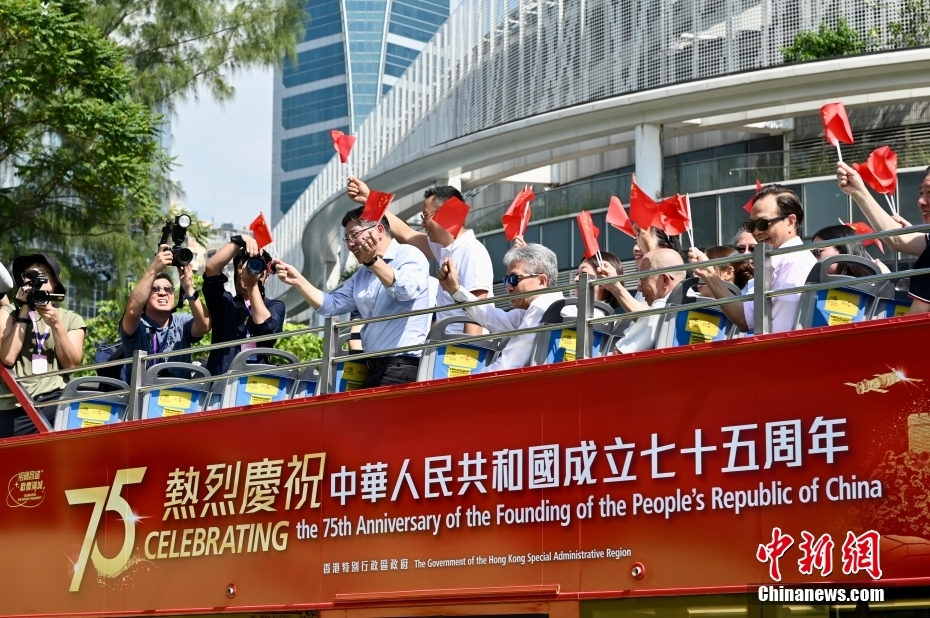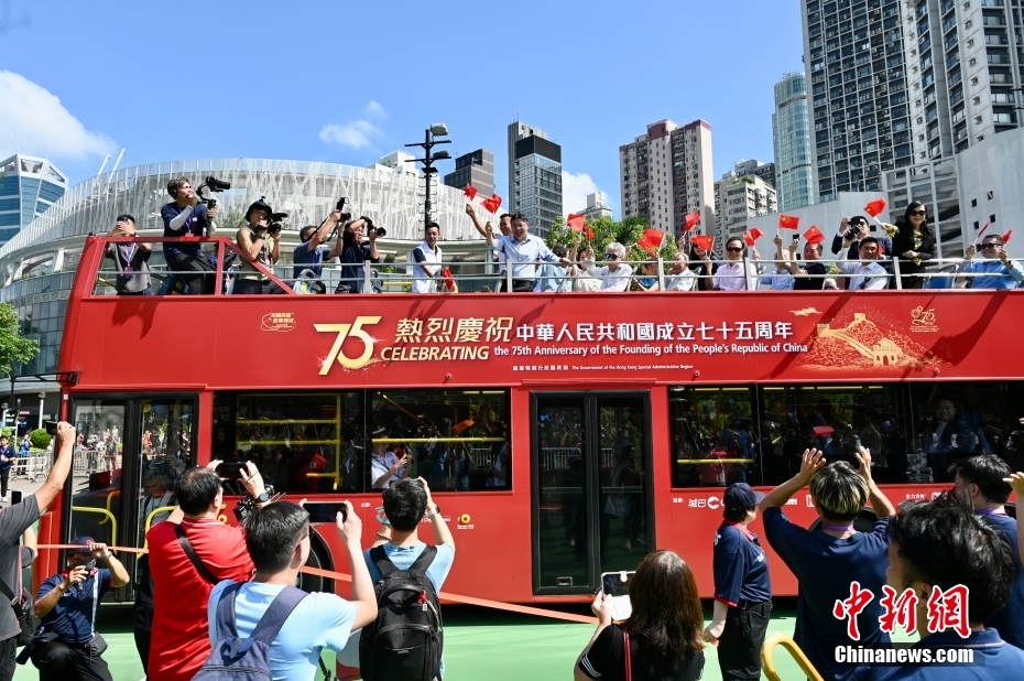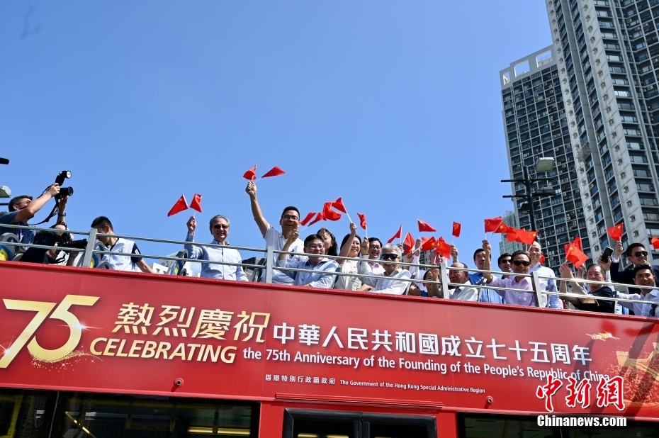 10月19日,香港特區政府運輸署舉辦慶祝中華人民共和國成立75周年巴士巡游活動。以國慶75周年為主題的開篷巴士,帶領巡游車隊從銅鑼灣維多利亞公園出發,途經歌頓道、英皇道、軒尼詩道、菲林明道和龍和道等,揮動國旗沿路與來往的市民及游客同賀國慶75周年。圖為嘉賓在國慶75周年主題開篷巴士上揮動國旗。中新社記者 李志華 攝