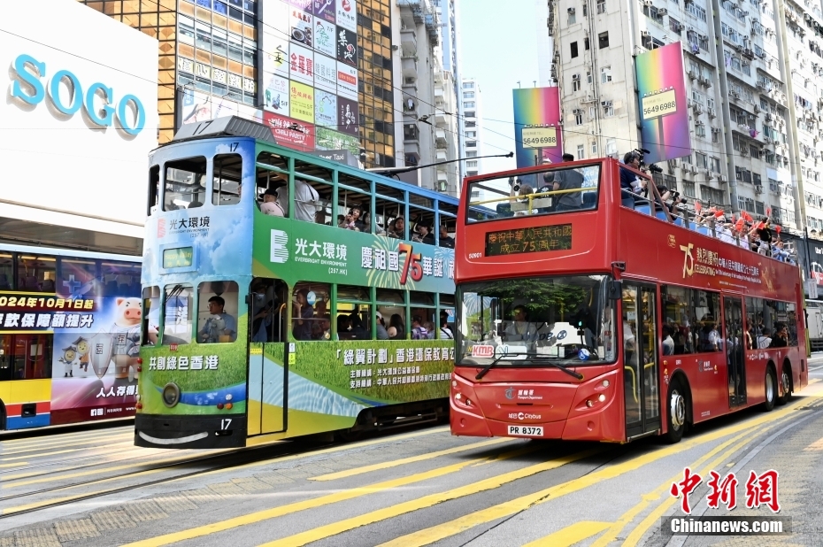 10月19日,香港特區政府運輸署舉辦慶祝中華人民共和國成立75周年巴士巡游活動。以國慶75周年為主題的開篷巴士,帶領巡游車隊從銅鑼灣維多利亞公園出發,途經歌頓道、英皇道、軒尼詩道、菲林明道和龍和道等,沿路與市民及游客同賀國慶75周年。圖為國慶75周年主題開篷巴士巡游至銅鑼灣街頭,與一輛國慶75周年主題電車相遇。中新社記者 李志華 攝