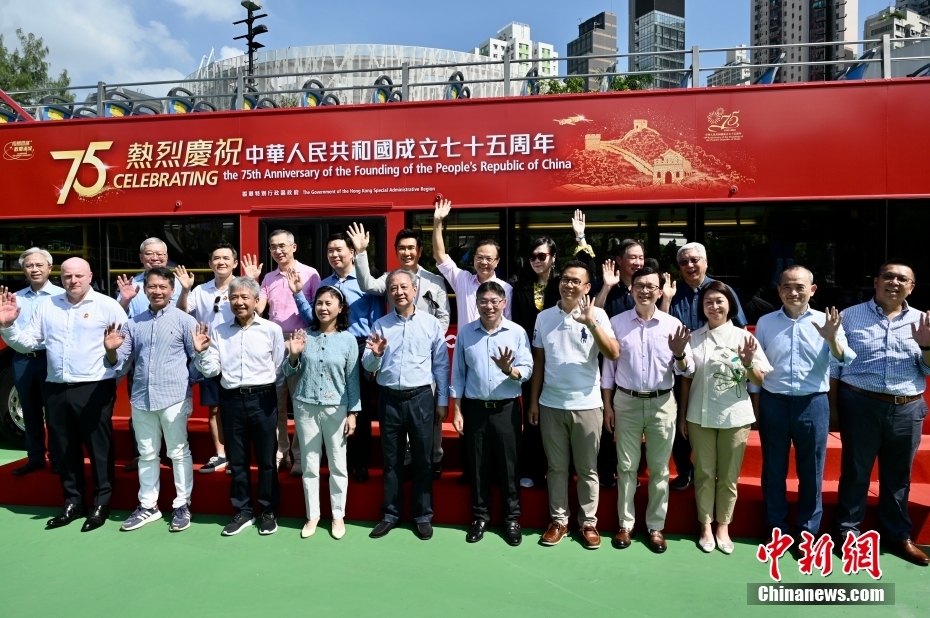 10月19日,香港特區政府運輸署舉辦慶祝中華人民共和國成立75周年巴士巡游活動。以國慶75周年為主題的開篷巴士,帶領巡游車隊從銅鑼灣維多利亞公園出發,途經歌頓道、英皇道、軒尼詩道、菲林明道和龍和道等,揮動國旗沿路與來往的市民及游客同賀國慶75周年。圖為嘉賓揮手歡迎現場人士參與活動。中新社記者 李志華 攝