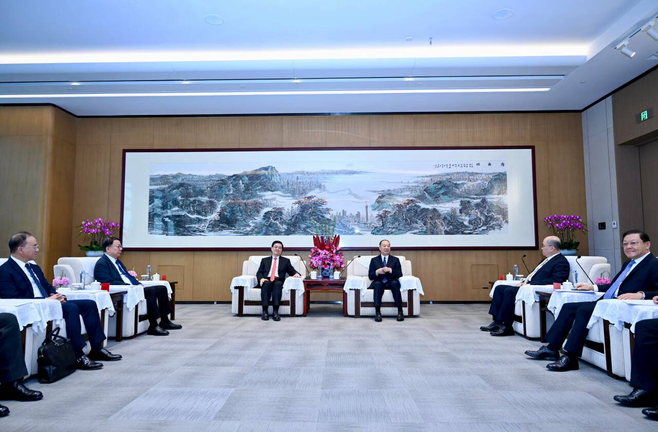 11月25日,黃坤明、王偉中與李家超、鄭雁雄率領的香港工商界代表團舉行工作會見。(圖片來源:南方+)
