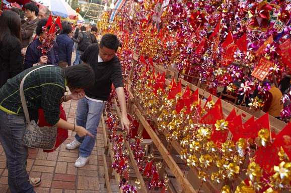 「逛花市、行大運」是源自廣東的風俗,也是港人過年的必備節目。全港多個公園及游樂場往往會在節前數日舉辦年宵花市,一直持續到除夕甚至初一凌晨,其中維多利亞公園和旺角花墟公園兩地的年宵花市最為熱鬧。琳瑯滿目的花市上,寓意大吉大利、來年好運的年桔、桃花、蝴蝶蘭、水仙是最受歡迎的品種,應蛇年而推出的「蛇紋新品蘭花」等創意花卉也賺足眼球。