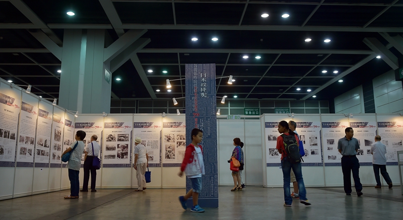 8月21日,市民在香港灣仔會議展覽中心參觀展覽。當日,「『日本投降矣』全港紀念抗戰勝利70周年」大型展覽在香港灣仔會議展覽中心舉行。該展覽為期3天,全面再現中華兒女奮勇抗敵的崢嶸歲月。新華社記者 何靖嘉 攝