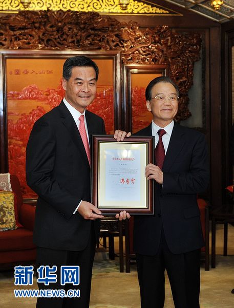 4月10日,中國國務院總理溫家寶在北京中南海向梁振英頒發任命梁振英為香港特別行政區第四任行政長官的國務院令。 新華社記者 劉建生攝