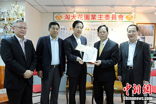4月24日,受彭清華主任委託,中聯辦副主任楊建平(左三)將溫家寶總理的親筆回信轉交給香港淘大花園業主委員會聯會主席葉興國。(圖片來源:中新社)